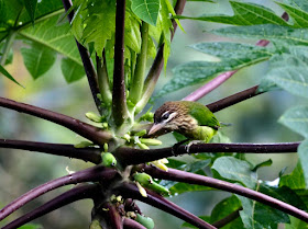 This green small Barbet came seeking for its fruit feed to the papaya tree, and finding no ripe fruit, it turned to the adjacent tree which had papaya flowers for nectar.