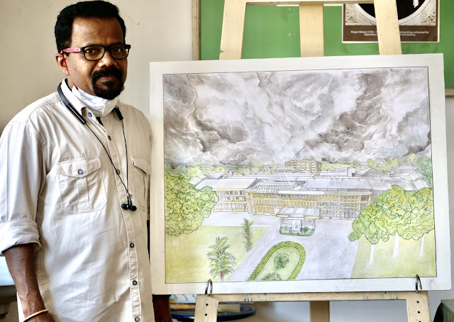 I watched Mr Sudhakaran, the artist at MOSC Medical College at work for a week on this excellent piece of art he produced to recall how the first building of the MOSC hospital looked fifty years ago.