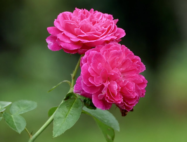 The first rose flower with a bud looks brilliant and elegant, whereas, one flower of the two, in the second photo, has a difference in the tinge of its colour and appearance. A close and careful inspection showed that the one flower in the three o'clock position showed early signs of ageing.